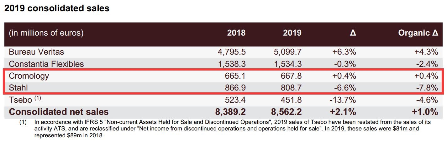 财报显示,Cromology全年实现销售收入6.678亿欧元(约合7.481亿美元),同比增长0.4%;来自运营的净利润为-1920万欧元,同比下降270.0%。斯塔尔(Stahl)全年实现销售收入8.087亿欧元(约合9.060亿美元),同比下降6.6%;来自运营的净利润为9430万欧元,同比下降14.5%。