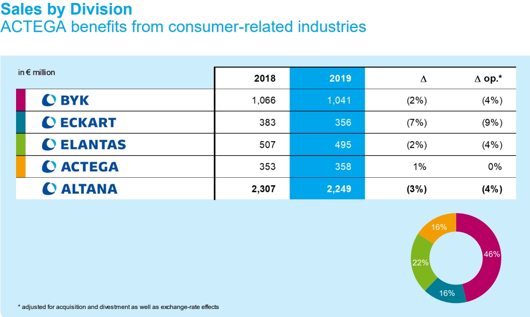 3月20日,特种化学品集团德国阿尔塔纳(ALTANA)公布2019年度报告。全年实现销售收入22.49亿欧元,同比下降3%;EBITDA为4.16亿欧元,同比下降3%;经营利润为2.62亿欧元,同比下降11%;净利润为1.69亿欧元,同比下降10%。