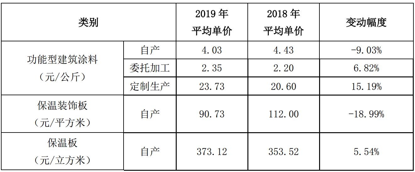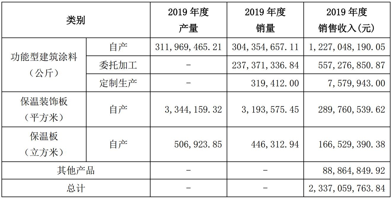 2019年,公司功能型建筑涂料呈产销两旺态势。全年涂料类产品生产量达31.20万吨,同比增长64.16%,销售量达54.20万吨,实现销售收入17.92亿元,同比增长55.63%,主营业务收入占比76.67%,毛利率36.63%,同比增长2.19个百分点。