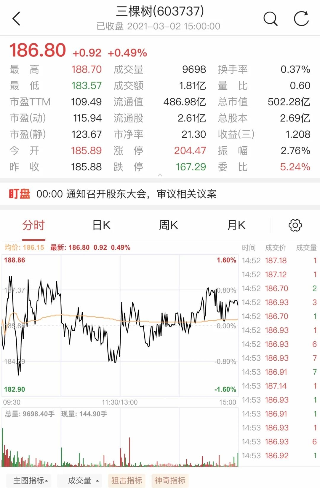 涂界记者注意到,三棵树昨日(3月1日)盘中最高价191.86元,股价创历史新高,盘中市值突破500亿元。不过,股价后来出现回落。截至昨日收盘,三棵树报185.88元/股,上涨3.39%,全日成交金额达到2.98亿元,换手率0.62%。根据昨日收盘价进行计算,三棵树总市值为499.8亿元。
