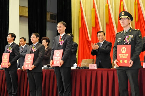 2015年1月25日,甘肃省科学技术奖励大会在宁卧庄宾馆召开。图为兰州化物所周峰研究员(前排右二)上台领奖