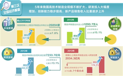 此次普查还表明我国经济运行的质量和效益在稳步提高。数据显示,2013年企业法人单位人均营业收入78.1万元,比2008年增长64.2%。2013年高技术制造业实现主营业务收入11.6万亿元,比2008年增长1.08倍。