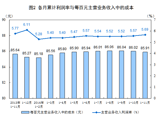 1-11月份,规模以上工业企业主营业务收入利润率为5.69%,每百元主营业务收入中的成本为85.91元,每百元资产实现的主营业务收入为123.5元,产成品存货周转天数为13.6天。