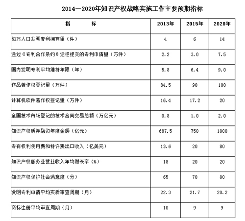 到2020年,知识产权法治环境更加完善,创造、运用、保护和管理知识产权的能力显著增强,知识产权意识深入人心,知识产权制度对经济发展、文化繁荣和社会建设的促进作用充分显现。
