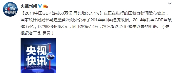 2014中国GDP首破60万亿 同比增7.4%创1990年来新低