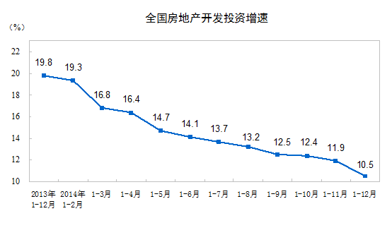 据国家统计局网站消息,2014 年,全国房地产开发投资 95036 亿元,比上年名义增长 10.5% (扣除价格因素实际增长 9.9% ),增速比 1-11 月份回落 1.4 个百分点,比 2013 年回落 9.3 个百分点。
