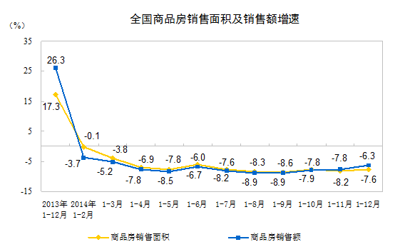 2014 年,商品房销售面积 120649 万平方米,比上年下降 7.6% ,降幅比 1-11 月份收窄 0.6 个百分点, 2013 年为增长 17.3% 。其中,住宅销售面积下降 9.1% ,办公楼销售面积下降 13.4% ,商业营业用房销售面积增长 7.2% 。商品房销售额 76292 亿元,下降 6.3% ,降幅比 1-11 月份收窄 1.5 个百分点, 2013 年为增长 26.3% 。其中,住宅销售额下降 7.8% ,办公楼销售额下降 21.4% ,商业营业用房销售额增长 7.6% 。