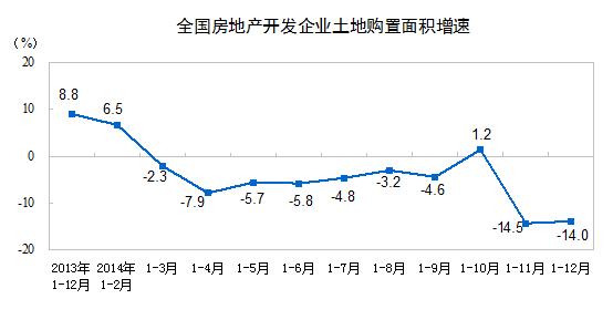 2014 年,房地产开发企业土地购置面积 33383 万平方米,比上年下降 14.0% ,降幅比 1-11 月份收窄 0.5 个百分点;土地成交价款 10020 亿元,增长 1.0% , 1-11 月份为下降 0.1% 。