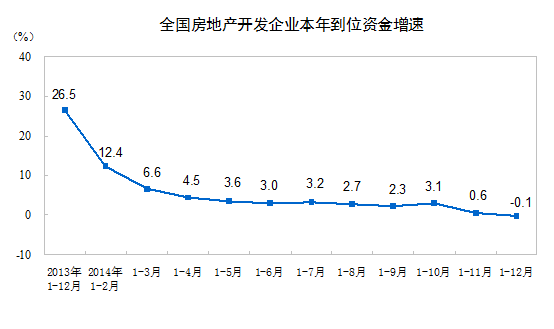 2014 年,房地产开发企业到位资金 121991 亿元,比上年下降 0.1% , 1-11 月份为增长 0.6% , 2013 年为增长 26.5% 。其中,国内贷款 21243 亿元,增长 8.0% ;利用外资 639 亿元,增长 19.7% ;自筹资金 50420 亿元,增长 6.3% ;其他资金 49690 亿元,下降 8.8% 。在其他资金中,定金及预收款 30238 亿元,下降 12.4% ;个人按揭贷款 13665 亿元,下降 2.6% 。