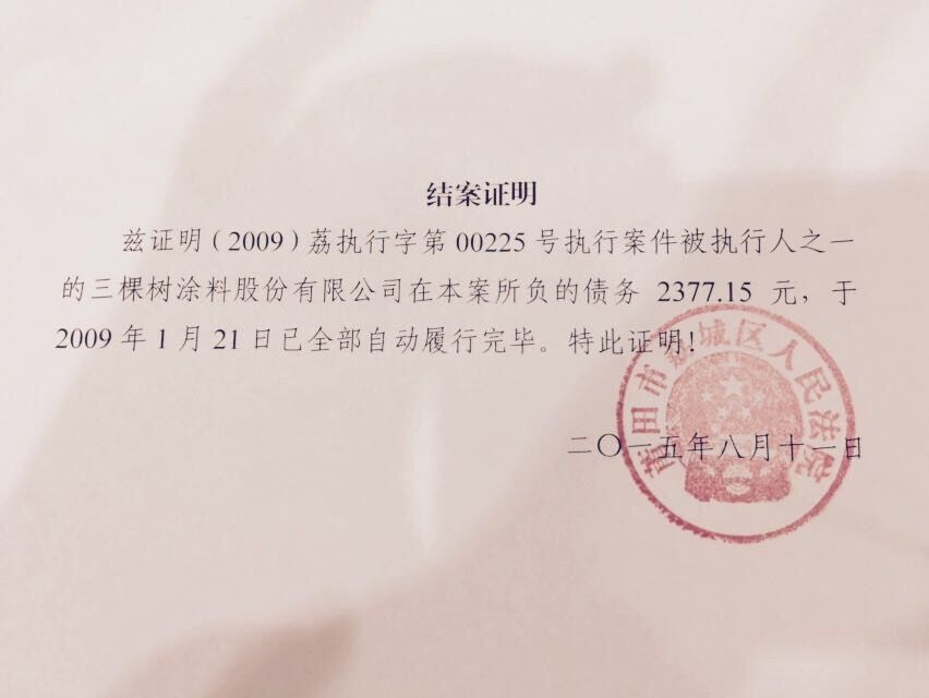 据了解,荔城区人民法院已在“全国法院执行案件信息管理系统”做了错误更正,现已在最高人民法院“执行信息公开网”上将“三棵树涂料股份有限公司”移出失信企业名单。