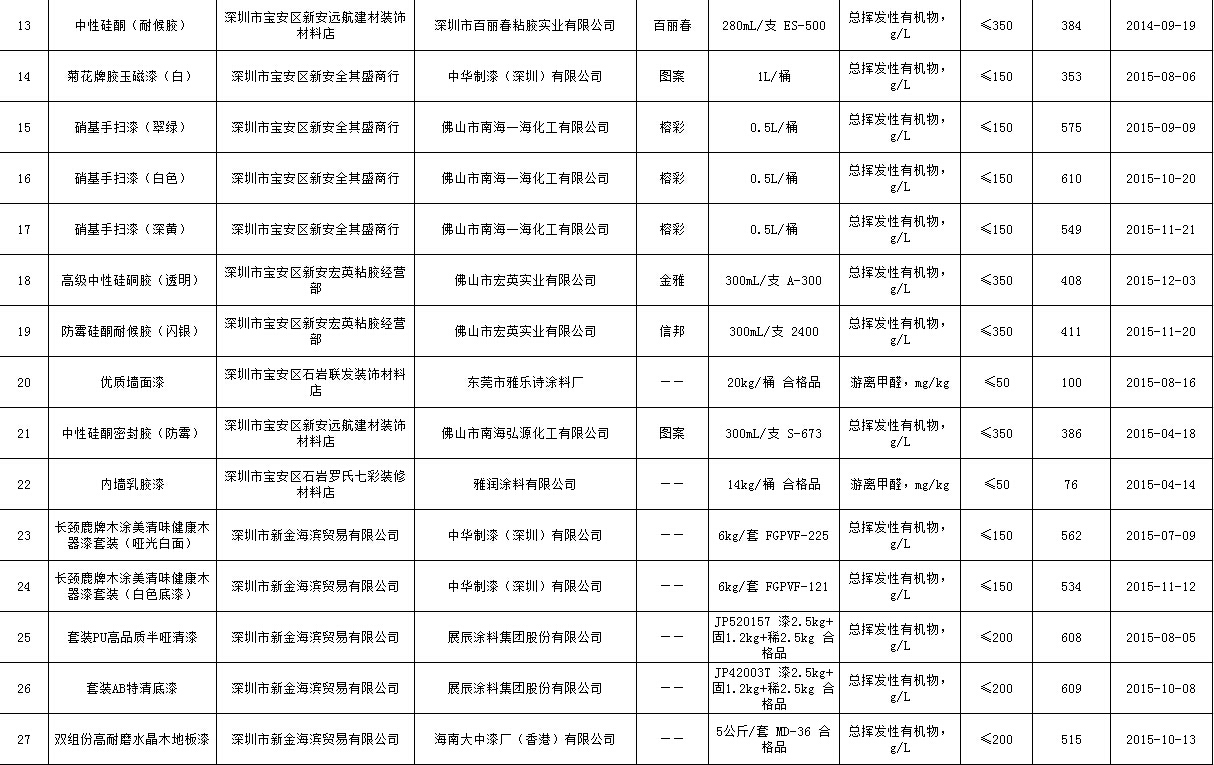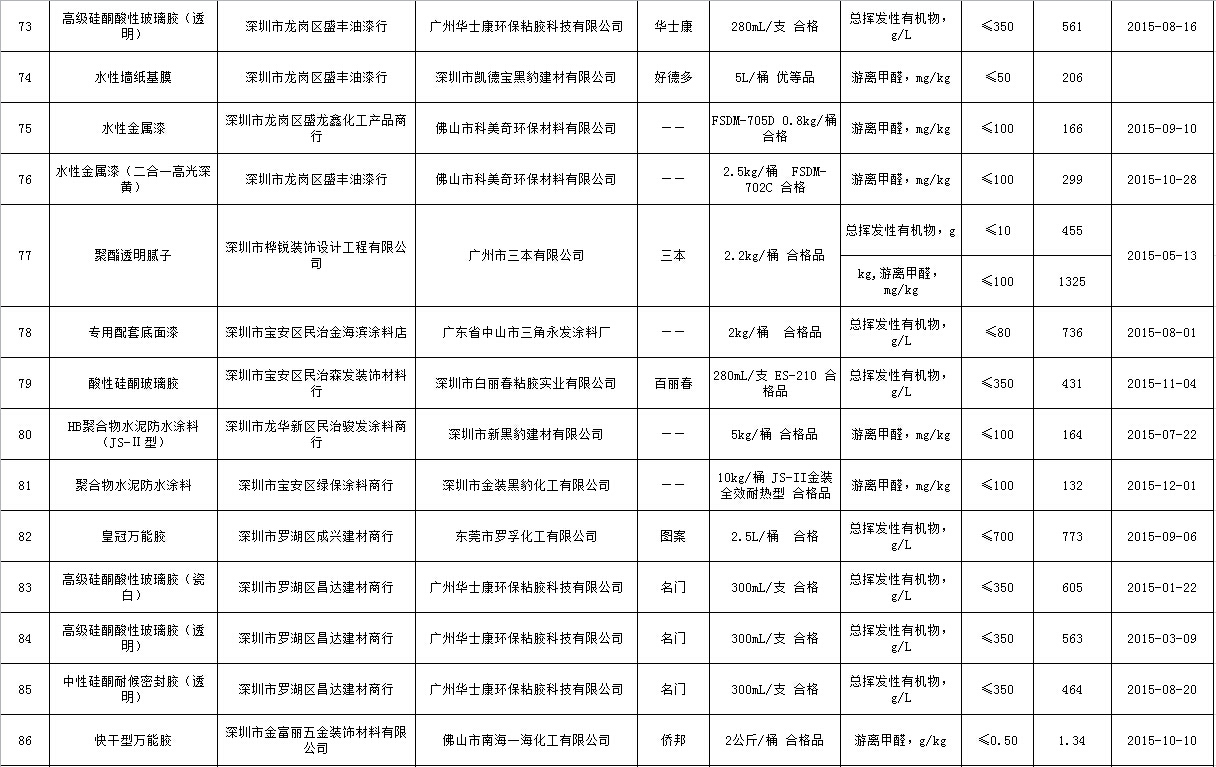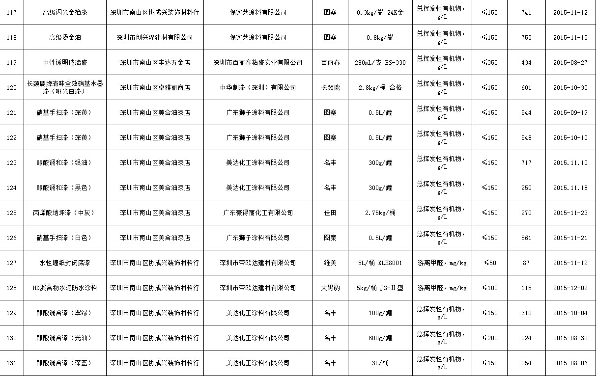 2016年6月27日,深圳市市场监督管理局在其官网公布了“2015年第四季度建筑装饰装修涂料及胶粘剂产品质量专项监督抽查结果”。本次共抽查了136家企业生产销售的1227批次产品,检验合格1113批次,不合格114批次。