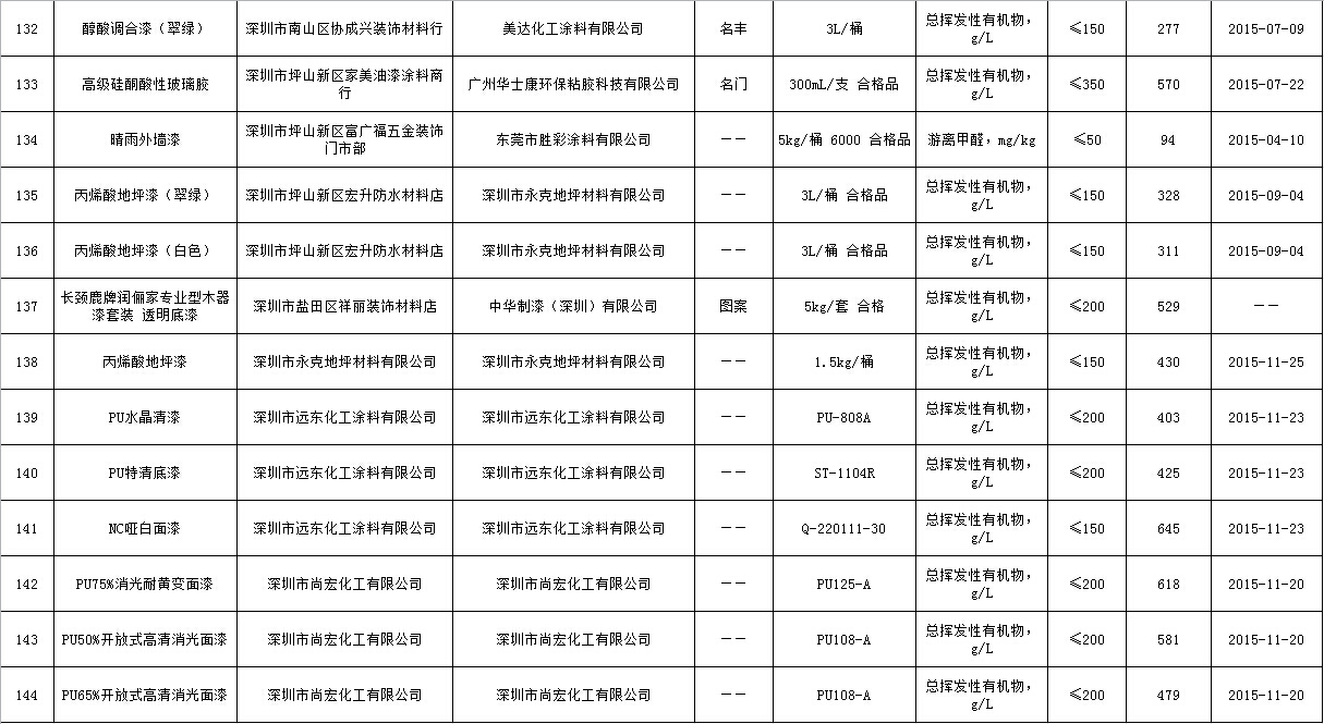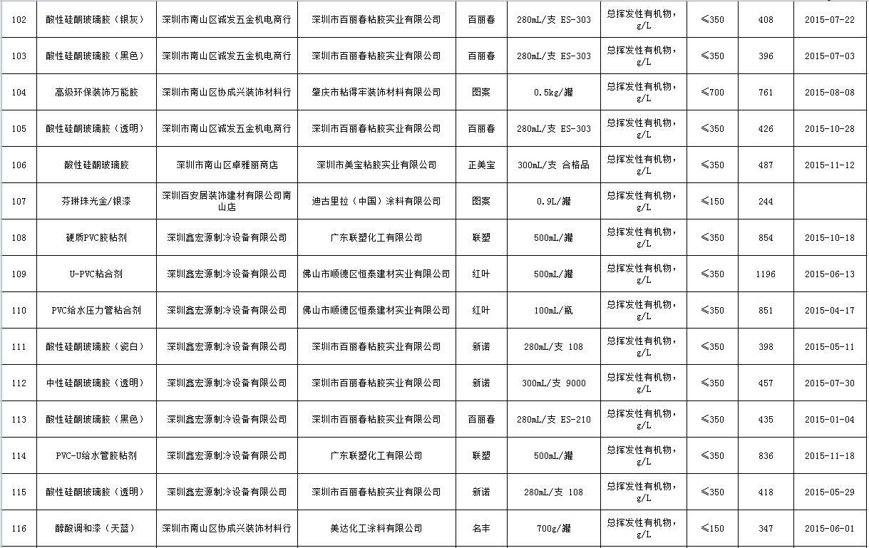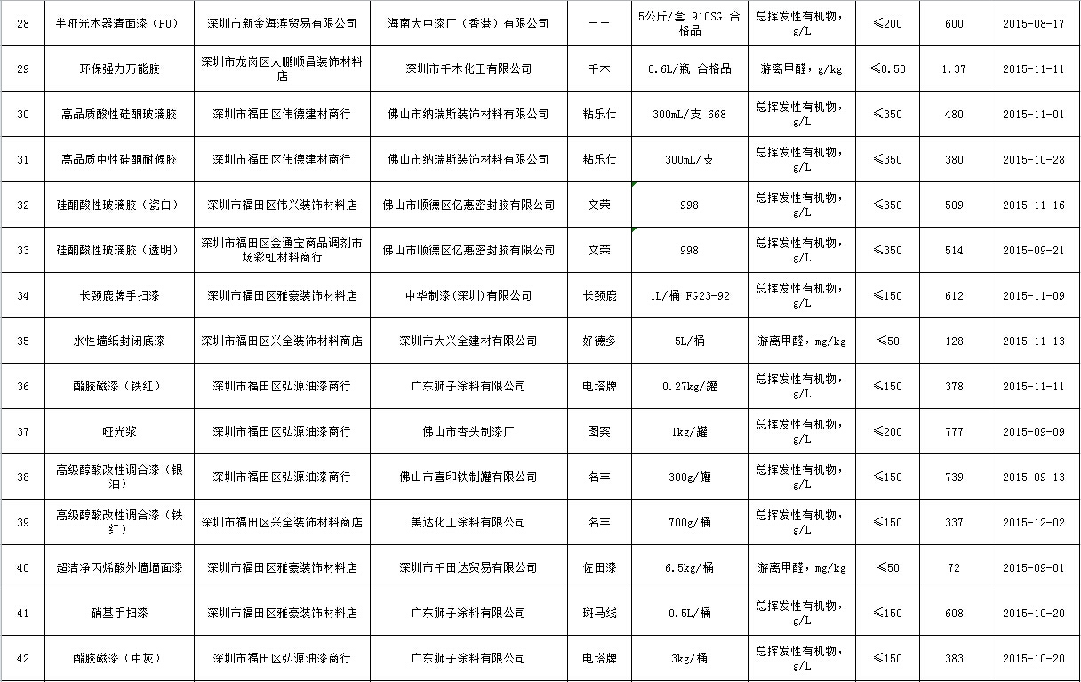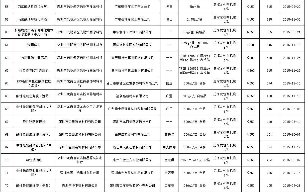 2016年6月27日,深圳市市场监督管理局在其官网公布了“2015年第四季度建筑装饰装修涂料及胶粘剂产品质量专项监督抽查结果”。本次共抽查了136家企业生产销售的1227批次产品,检验合格1113批次,不合格114批次。