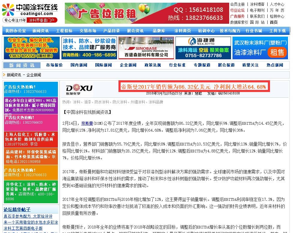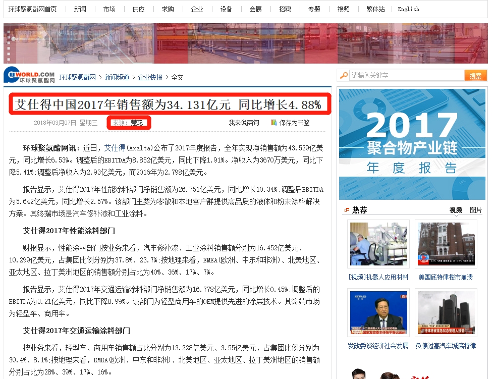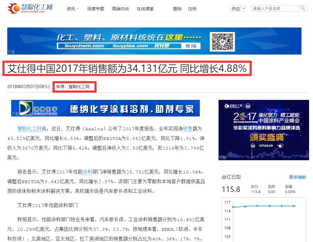 摘要:慧聪化工网、中外涂料网、中国涂料在线等网站于2018年3月7日发布了标题为“艾仕得中国2017年销售额为34.131亿元 同比增长4.88%”的文章。经查,上述网站均未经许可擅自非法转载涂界原创文章。