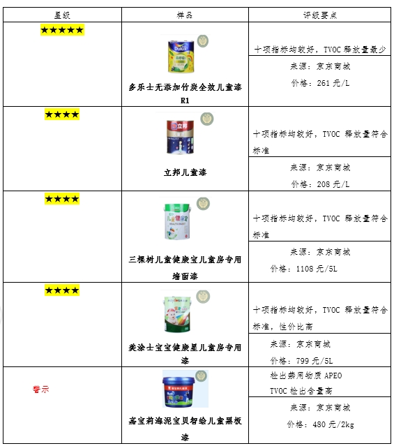 8月7日,深圳市消费者委员会发布2018年内墙涂料比较试验报告。根据本次测试结果显示,依据最新儿童漆国家标准,嘉宝莉儿童智绘黑板漆检出禁用物质APEO(烷基酚聚氧乙烯醚),检测结果总挥发性有机化合物(TVOC)含量较高。另外儿童漆的环保性能不是越贵越好,美涂士宝宝健康星儿童房专用漆性价比较高。