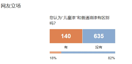 然而儿童漆在国内面世以来,其环保性、健康性等“功能”屡遭质疑。在前期对儿童漆和普通油漆是否有区别的网络调查中,82%的网友认为儿童漆和普通油漆无区别。
