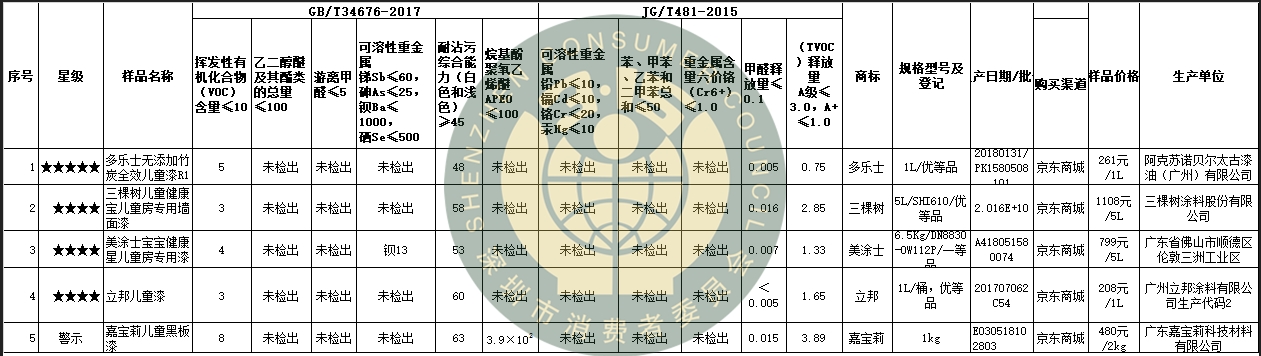 为此,深圳市消委会联合宝安区消委会、福田区消委会、龙岗区消委会共同委托深圳市品质消费研究院对在售的内墙儿童漆产品开展比较测评。本次比较试验5款儿童内墙漆样品均为工作人员模拟普通消费者在京东商城购买,儿童内墙漆包含4款调色乳胶漆和1款市场新兴的儿童黑板漆。