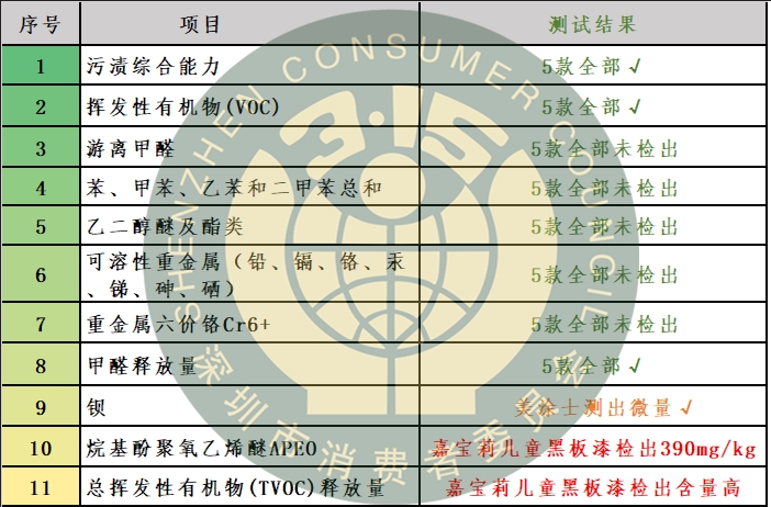 本次共测评多乐士、立邦、三棵树、美涂士、嘉宝莉等5款儿童漆,从测试情况看,多乐士等4款总体环保性能及耐污渍性较好,多项环保指标未检出,各品牌间差异微弱。但嘉宝莉儿童黑板漆检出禁用物质APEO,且TVOC含量高。