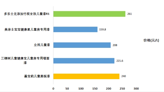 另外,测评发现五款儿童内墙漆价格(换算成每升单价)相对接近,美涂士宝宝健康星儿童房专用墙面漆性价比最高。