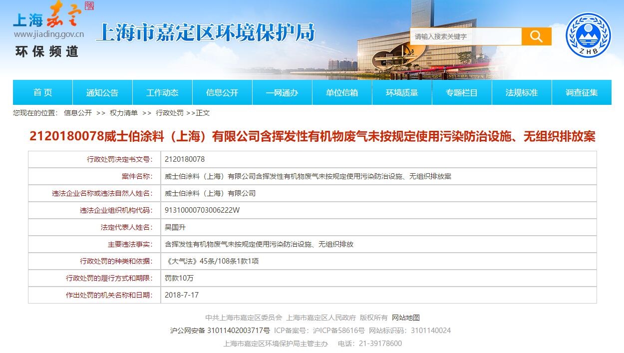 7月25日,上海市嘉定区环境保护局发布行政处罚决定书,威士伯涂料(上海)有限公司因“含挥发性有机物废气未按规定使用污染防治设施、无组织排放”遭到处罚,罚款金额为10万元,作出处罚日期为2018年7月17日。