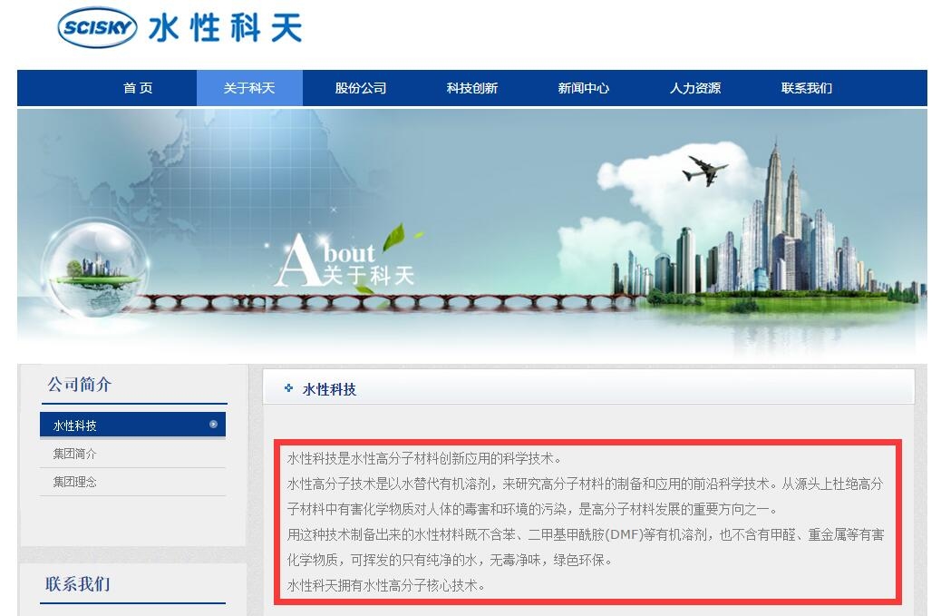 水性科天官网公开的资料显示,兰州科天环保节能科技有限公司是兰州科天投资控股股份有限公司(以下简称“科天集团”)子公司,提供家装、家具、建涂工程水性环保系列化材料。科天集团官方网站介绍,科天集团从事“水性高分子技术”研究和应用,并将其称为“水性科技”。