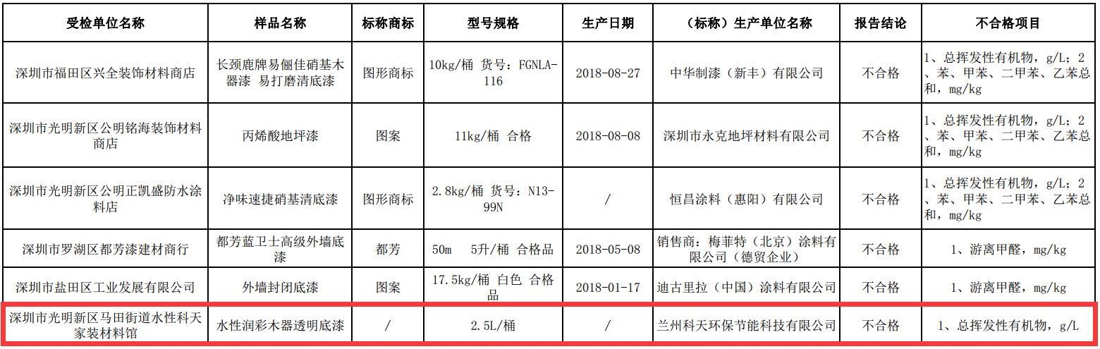 4月30日,深圳市市场监督管理局通报2018年建筑装饰装修涂料产品质量监督抽查结果,本次共抽查了94家企业生产销售的500批次产品,检验发现不合格样品29批次。其中,标榜“水性科技”、斥资重金宣传“无毒家装”的水性科天旗下产品被检不合格。