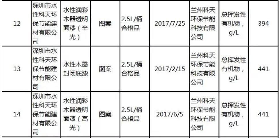 抽检结果显示,水性科天三款产品分别为“水性润彩木器透明面漆(半光)”(规格型号“2.5L/桶 合格品”,生产日期2017-07-25)、“水性木器封闭底漆”(规格型号“2.5L/桶 合格品”,生产日期2017-02-15)、“水性润彩木器透明面漆(高光)”(规格型号“2.5L/桶 合格品”,生产日期2017-06-05),它们的“总挥发性有机物”实测值分别为394g/L、441g/L、441g/L。