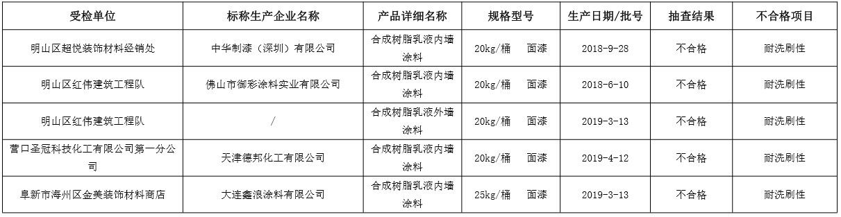 一款“合成树脂乳液内墙涂料”(型号规格:20kg/桶 面漆,生产日期:2018-9-28,标称生产单位“中华制漆(深圳)有限公司”)的“耐洗刷性”项目被检不合格。一款“合成树脂乳液内墙涂料”(型号规格:20kg/桶 面漆,生产日期:2019-4-12,标称生产单位“天津德邦化工有限公司”)的“耐洗刷性”项目被检不合格。