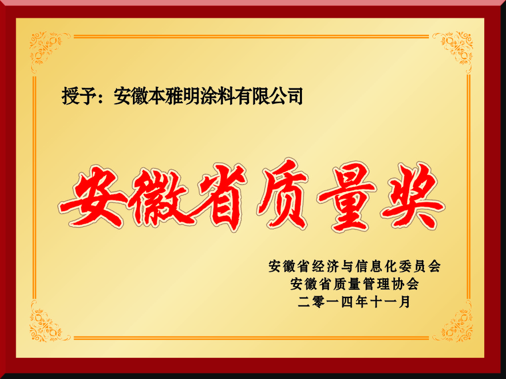本网记者12月17日从安徽省经济和信息化委员会官网获悉,2014年安徽省质量奖企业名单正式揭晓,其中安徽本雅明涂料有限公司被认定为2014年安徽省质量奖企业。“安徽省质量奖”的评选和认定,有力促进了企业质量管理水平提升,增强了企业的综合竞争力。