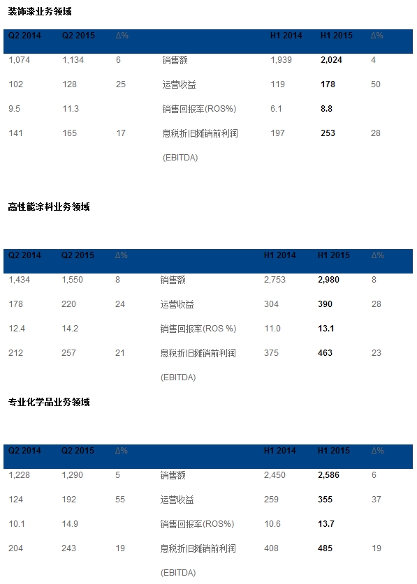 装饰漆业务领域。保持稳健的盈利增长,运营收益上涨25%,销售额增加了6%。运营收益的提升主要归功于全新运营模式、降低成本、减少重组开支和严格的成本控制,以及有利的汇率走势。同时,有利的货币因素也为销售额贡献了6%的增长。装饰漆业务第二季度的销量在亚洲实现增长,在欧洲及拉丁美洲有所下降。