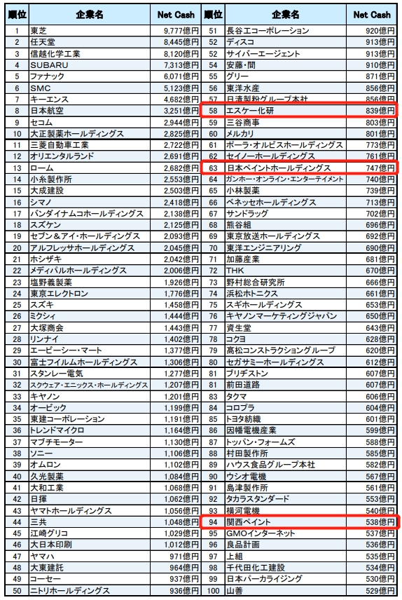 根据榜单显示,位居排名榜首位的是东芝(净现金流量为9777亿日元),紧接着依次为任天堂(净现金流量为8445亿日元)、信越化学工业(净现金流量为8120亿日元)、SUBARU(净现金流量为7313亿日)、发那科(净现金流量为6071亿日元)、SMC(净现金流量为5123亿日元)、基恩士(净现金流量为4682亿日元),日本航空(净现金流量为3251亿日元)