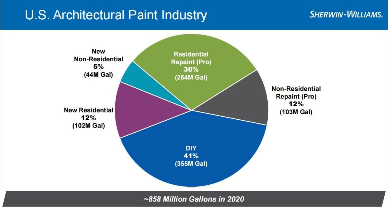 根据金融社区演示显示,2020年美国建筑涂料市场产量为8.58亿加仑,约合438.42万吨,同比增长3.2%。其中,DIY占比41%,约合3.55亿加仑;住宅重涂(工程类)占比30%,约合2.54亿加仑;新建住宅占比12%,约合1.02亿加仑;非住宅重涂(工程)占比12%,约合1.02亿加仑;新建非住宅占比5%,约合0.44亿加仑。(1美国液体加仑= 3.785升,1升=13.5万吨)