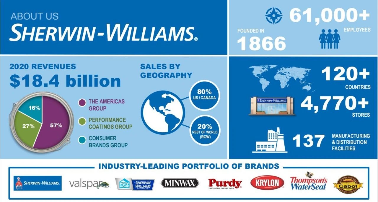 宣伟始建于1866年,全球总部位于俄亥俄州克利夫兰,是世界上成立最早的专业涂料公司之一,在诞生以来的150多年的时间里,宣伟成长步伐稳健,并发展成为当今世界最大的涂料企业之一。集团旗下拥有有三大业务部门——美洲集团、消费者品牌集团、高性能涂料集团,拥有Sherwin-Williams®,Valspar®,华润,Dutch Boy®,HGTV HOME™,Cabot®等众多知名品牌。业务遍及全球100多个国家和地区。