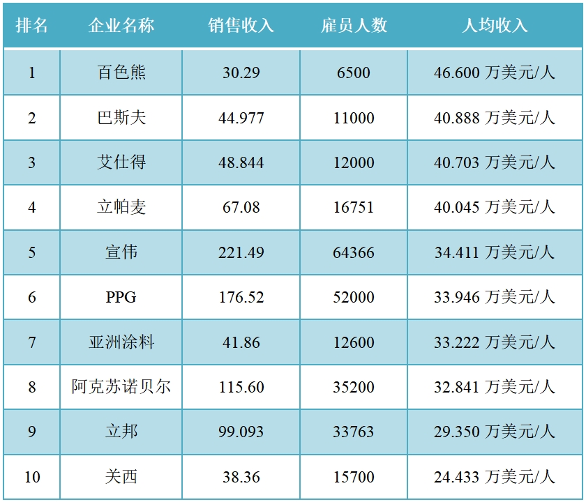 在人均产值方面,百色熊以46.600万美元/人的人均产值位居榜首,巴斯夫则以40.888万美元/人位列第二,艾仕得以40.703万美元/人位列第三。一个员工能为企业创造多少产值,它是衡量企业核心竞争力的重要指标,也从另一个层面反映出人才的价值和创富能力。