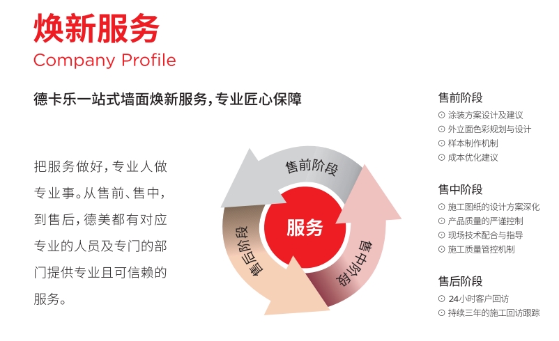 针对城市更新,德成新材料集团不断进行技术创新,反复研究产品和工艺,在庆典期间推出了德卡乐旧墙翻新系统和德卡乐美丽乡村专用产品。其中,德卡乐焕新服务是针对美丽乡村、旧城改造、自建房的内外墙、地坪、基辅材等推出的特色项目,德美从售前、售中、售后都有对应的专业人员和部门提供专业的服务。