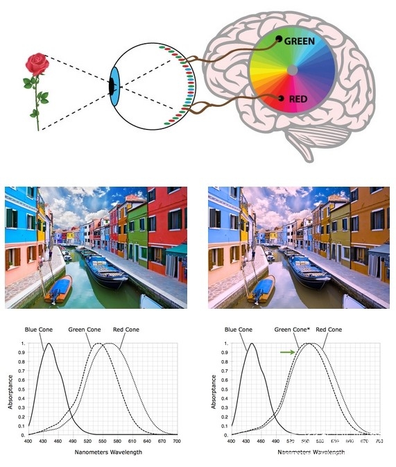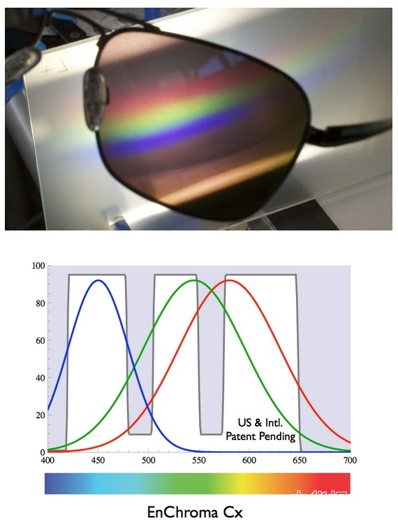 绿色弱视患者的M-锥状细胞的敏感区域会移向较长波长区域,而红色盲患者的L-锥状细胞的敏感区域则移向了较短的波长。Enchroma特别设计的滤镜可以选择性地阻挡那些影响患者色觉的特定波长光线。