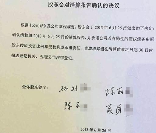 更奇怪的是,在当天的《股东会对清算报告确认的决议》中,她看到了自己的”签名“,签署时间是2013年6月26日。