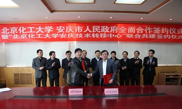 2014年12月5日,北京化工大学与安庆市人民政府举行了全面合作签约仪式暨“北京化工大学安庆技术转移中心”联合共建签约仪式。图为签约仪式现场