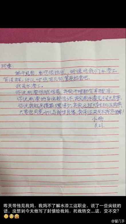 6月21日,90后水漆工小杨写了一封亲笔信,让女友晨晨转交给准岳母。小杨在这封信里透露端午节跟女友见父母,女友母亲对其职业有“担忧”和“误解”,所以特意“写几句,算是扫盲”。他在信里写道:“我是水漆工。你说刷漆很脏很累,其实干啥都有辛酸泪。你说刷漆的身体都很坏,其实刷水漆无污染无危害。你说我起早摸黑赚得少,其实远超大学生那三瓜两枣。只要您同意我和您女儿结良缘,我保证买房不找您借钱!”