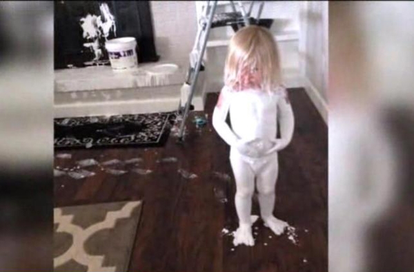 找到女儿后,这位妈妈大吃一惊:小姑娘脖子以下都被染成了白色。显然,她打翻了油漆桶,还把油漆都洒到了身上。小女孩呆呆地站在地板上,显然还不清楚都发生了什么。