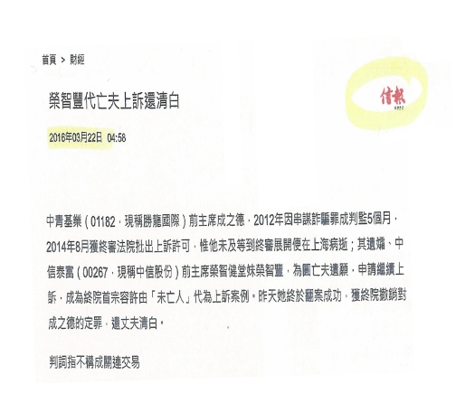 当天,香港终审法院五院法官一致通过,撤销了对成之德的原有定罪,沉冤终得清白。香港及海外媒体以“荣智丰代亡夫诉还清白”为题(下图一),昭示天下,广为传播。平反后约10日,正是一个特殊的日子。清明时节雨纷纷,路上行人欲断魂。这一天,荣智丰女士备了香槟酒,来到丈夫成之德墓前,慰藉在天之灵。同时,她也告戒自我:“一定要重振旗鼓,找回自尊,讨回人间公道!”
