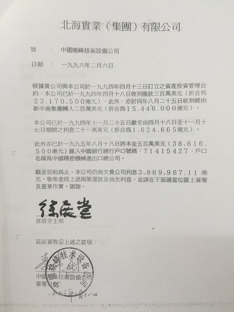 豪升公司在晓峰公司存有数百万的周转金,双方有20多年的合作关系。1997年政企分开时,晓峰公司与上级单位脱勾,债权债务都按相关规定转给相关公司。其中,香港北海集团欠晓峰公司的资产合作债权,被自然转给豪升公司,但至今整整20年过去,北海集团仍未还款。关于此事,荣智丰女士还专门出示了欠款证据(下图)。