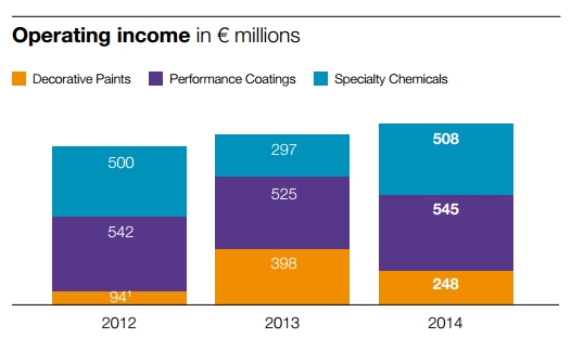 2014年,阿克苏诺贝尔高性能涂料事业部占比39%,销售额为55.89亿欧元;装饰涂料事业部占比27%,销售额为39.09亿欧元;特种化学品事业部占比34%,销售额为48.83亿欧元。剔除去特种化学品事业部业务销售后,阿克苏诺贝尔2014年实际涂料销售额为114.39亿美元。