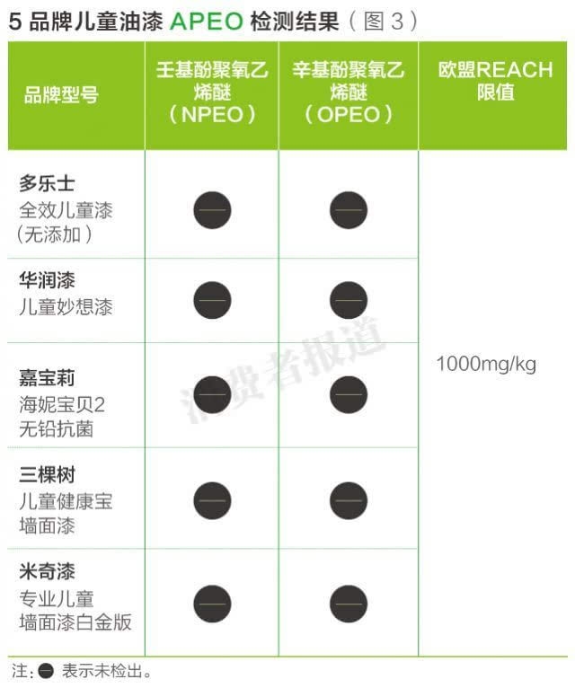 《消费者报道》此次送检多乐士、华润漆、嘉宝莉等5 款市场主流儿童漆,就参考欧盟标准对APEO进行了检测。