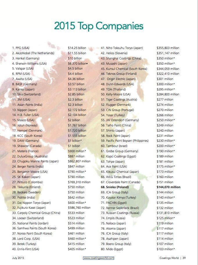 据2015年排行榜显示,全球共有80家2014年涂料、粘合剂、密封剂等相关业务销售额在1亿美元以上的企业上榜,其中,日本16家,美国14家,德国5家,韩国4家,中国、土耳其、埃及各3家企业。波兰Snieka和埃及Mido分别以1.44亿美元、1.03亿美元销售额首次上榜。