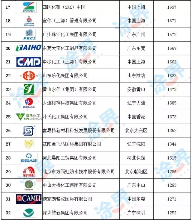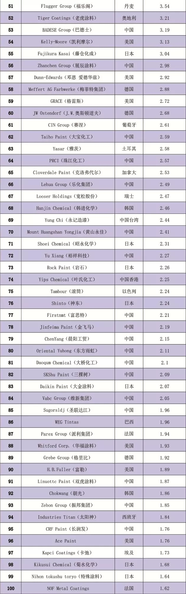 2015年5月4日,国内涂料行业首家财经媒体《涂界》(Coatings Industry)杂志联合中国涂界网发布了“2015年世界涂料企业100强排行榜(TOP 100 Companies)”。该排行榜基于根据全球涂料企业2014财年涂料业务的销售业绩的综合排名。根据榜单来看,上榜企业最低入围门槛为1.62亿美元。