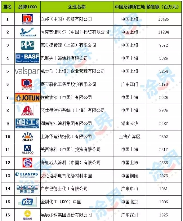 据悉,这是2010年以来该杂志第6次发布该榜单。榜单以企业上一年度的涂料业务销售业绩作为排行标准,以1亿美元作为进入门槛。按此标准,根据《涂界》杂志发布的“2015年中国涂料企业50强排行榜”显示,除嘉宝莉、上海涂料、大宝化工外,湘江涂料、巴德士、展辰涂料、珠江化工、乐化漆业、裕祥集团、叶氏化工、富思特、晨阳集团、维新集团、长润发、三棵树、双虎涂料、兰陵化工、振邦集团、中华制漆、君子兰涂料、江门制漆、美涂士、松井新材、金力泰等20多家中国涂料企业,其每年的销售业绩均超过1亿美元。