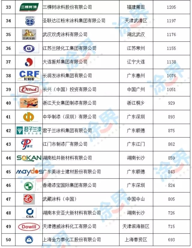 2015年5月12日,国内涂料行业首家财经媒体《涂界》(Coatings Industry)杂志联合中国涂界网(www.itujie.con.cn)正式发布了“2015年中国涂料企业50强排行榜”。该排行榜以企业2014财年销售收入或营业收入指标作为最终排序指标。根据榜单来看,上榜企业最低入围门槛为6.93亿元。