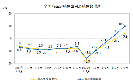 2015年1-6月份,商品房销售面积50264万平方米,同比增长3.9%,1-5月份为下降0.2%。其中,住宅销售面积增长4.5%,办公楼销售面积下降2.4%,商业营业用房销售面积增长3.5%。商品房销售额34259亿元,增长10.0%,增速提高6.9个百分点。其中,住宅销售额增长12.9%,办公楼销售额下降1.8%,商业营业用房销售额下降1.2%。