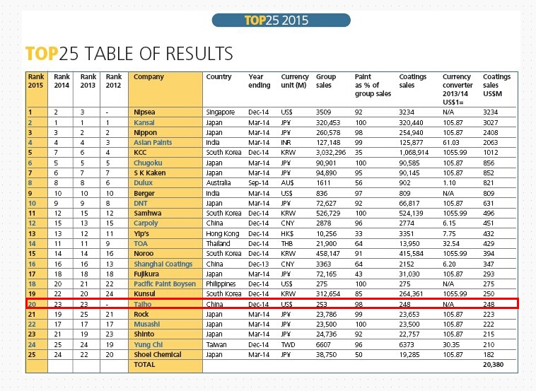 2015年4月29日,国内涂料行业首家财经媒体《涂界》(Coatings Industry)杂志联合中国涂界网发布了“2015年亚太地区涂料企业50强排行榜”。该排行榜基于根据亚太地区涂料企业2014财年涂料业务的销售业绩的综合排名。