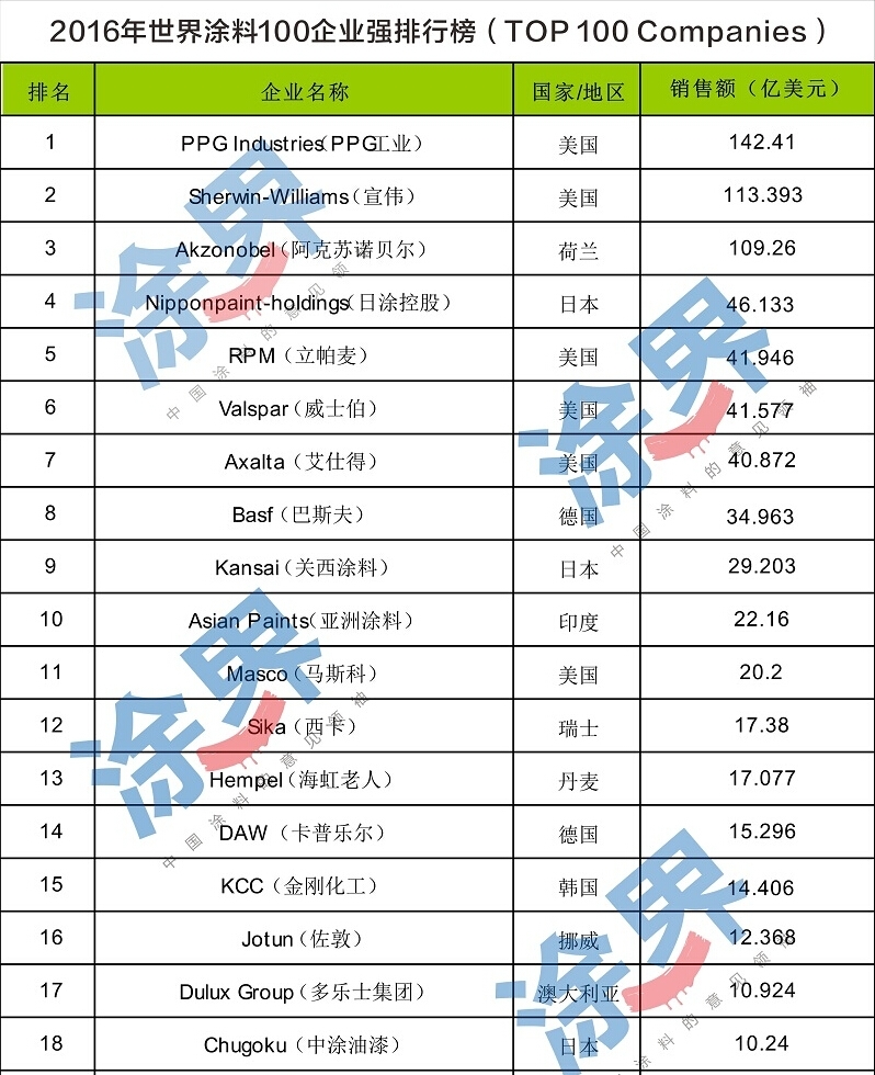9月26日,美国《化学周刊》2016年度全球化工10亿美元俱乐部排名出炉,阿克苏诺贝尔、PPG、宣伟、RPM、威士伯等世界涂料巨头上榜。但遗憾的是,日涂控股、艾仕得超过40亿美元的涂料企业却没有被纳入榜单。